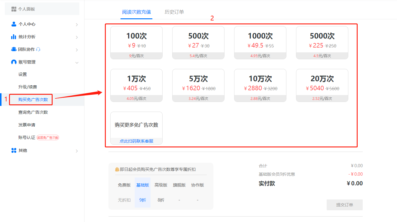 免廣告次數(shù)就是您賬號下所有書本總的免去底部廣告的次數(shù),比如基礎(chǔ)版免廣告次數(shù)是2萬次,那么您賬號下所有書本被看次數(shù)在2萬次以內(nèi),就沒有廣告,達到2萬次以后,書本下方就會出現(xiàn)廣告。