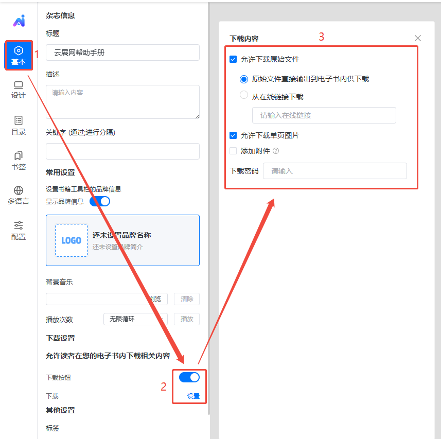 點(diǎn)擊【基本】,下方打開(kāi)下載按鈕,電子書(shū)的工具欄上就會(huì)出現(xiàn)下載按鈕,然后點(diǎn)擊【設(shè)置】,設(shè)置下載內(nèi)容。