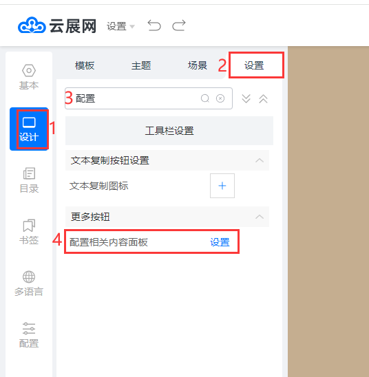 點(diǎn)擊【設(shè)計(jì)】,點(diǎn)擊【設(shè)置】,在搜索欄輸入”配置”查找,點(diǎn)擊【配置相關(guān)內(nèi)容面板】設(shè)置