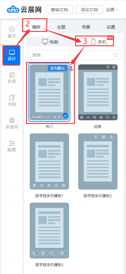 點(diǎn)擊【設(shè)計(jì)】,點(diǎn)擊【模板】,點(diǎn)擊【手機(jī)】,選擇熱門模板
