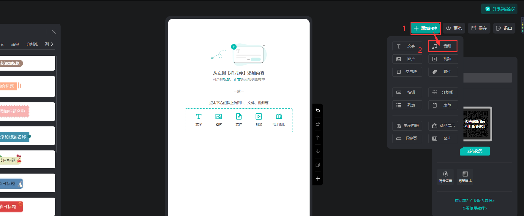 點(diǎn)擊【添加組件】,點(diǎn)擊【音頻】,上傳mp3格式的音頻文件添加到頁(yè)面上