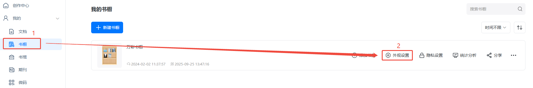 a)點(diǎn)擊【書櫥】找到對(duì)應(yīng)書櫥,點(diǎn)擊【外觀設(shè)置】,進(jìn)入管理書櫥界面。
