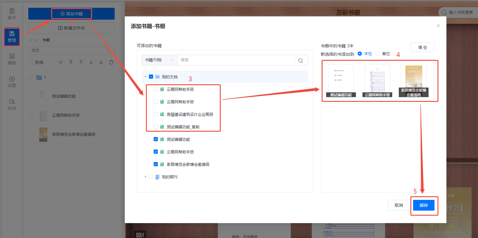 b)先點(diǎn)擊【管理】,再點(diǎn)擊【添加書籍】,勾選需要添加的書籍,點(diǎn)擊保存。