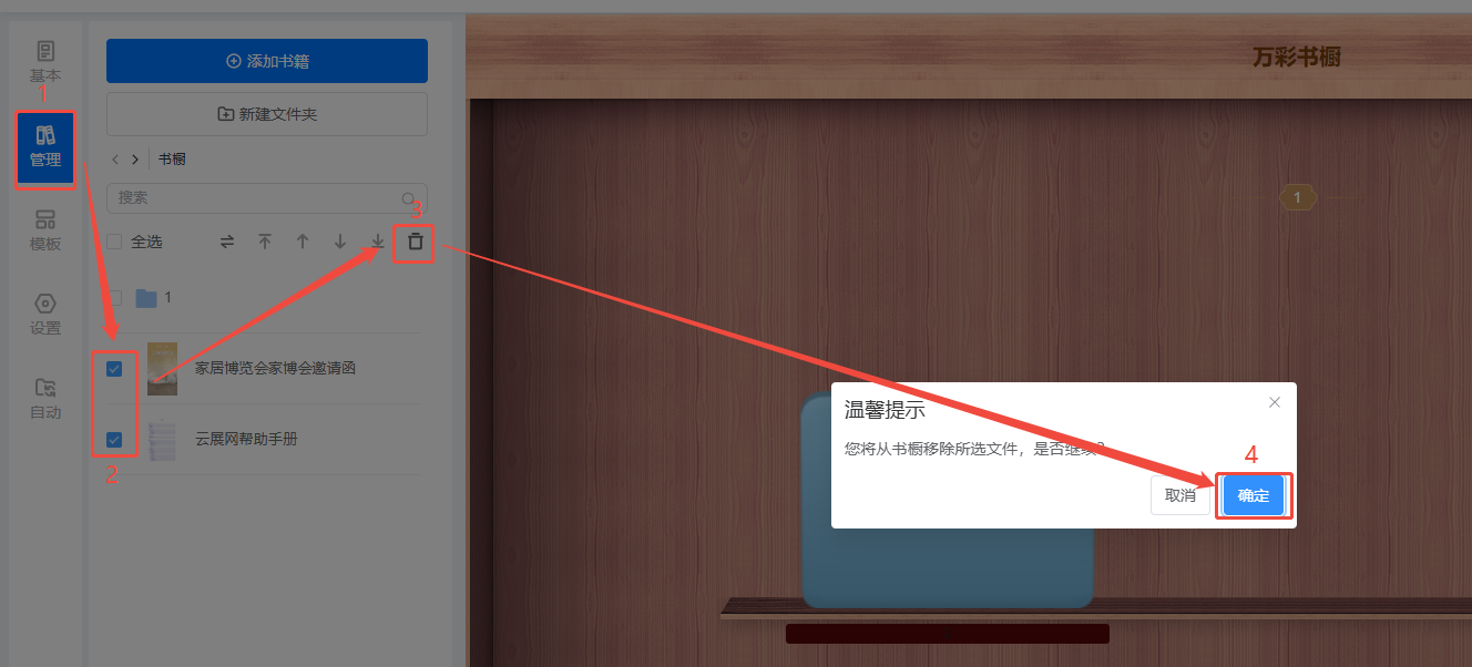 b)先點(diǎn)擊【管理】,勾選需要移除的書籍,點(diǎn)擊垃圾桶圖標(biāo),最后點(diǎn)擊確定即可移除書籍。
