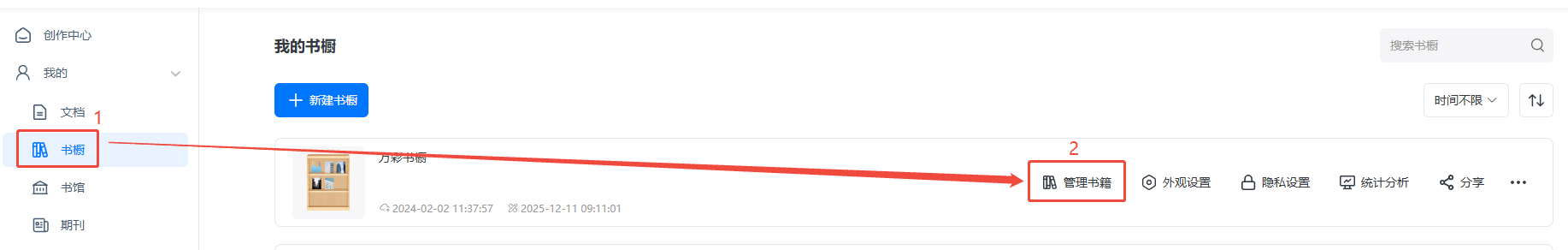 a)點(diǎn)擊【書櫥】找到對(duì)應(yīng)書櫥,點(diǎn)擊【管理書籍】,進(jìn)入管理書櫥界面。