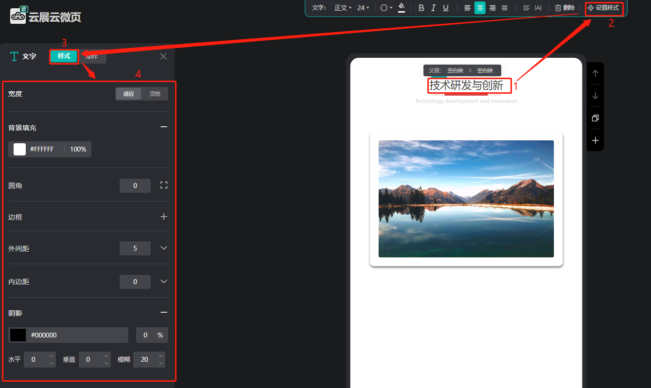 選中微碼中的文字,上方點擊【設(shè)置樣式】,然后左邊彈框點擊【樣式】,最后在下方設(shè)置參數(shù)。