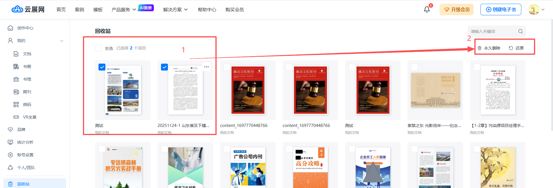 1) 選擇雜志文件后,點擊“還原”或“永久刪除”。若選擇還原,書籍將回到原文件夾;若選擇永久刪除,書籍將不再存儲于云展網(wǎng),且無法找回。
