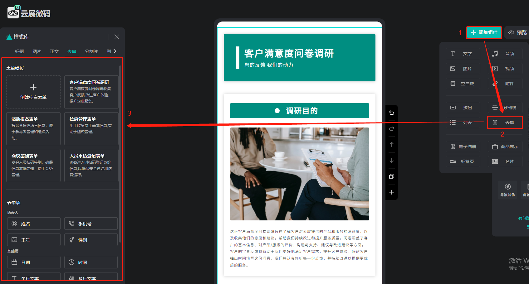 點擊【添加組件】,點擊【表單】,左側(cè)選擇【表單模板】添加到頁面上。