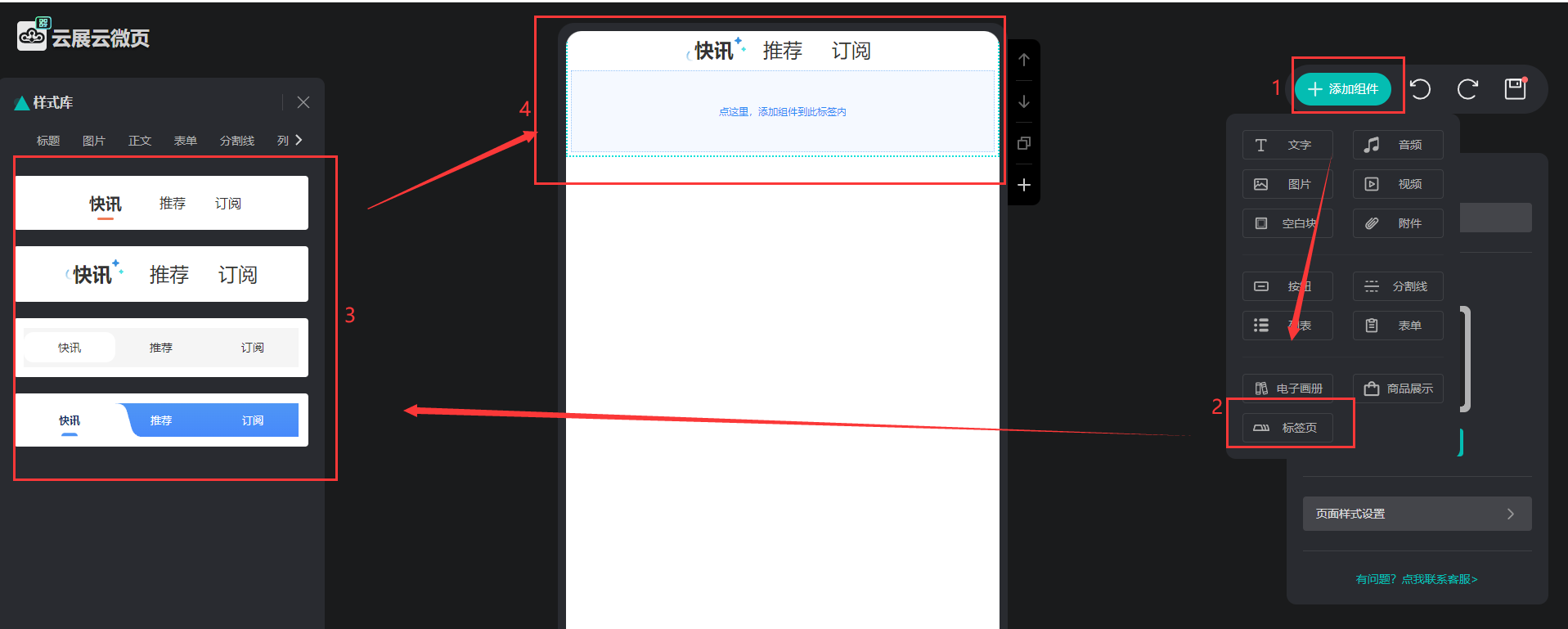 點擊【添加組件】,點擊【標簽頁】,在左邊選擇標簽樣式添加到微碼上。