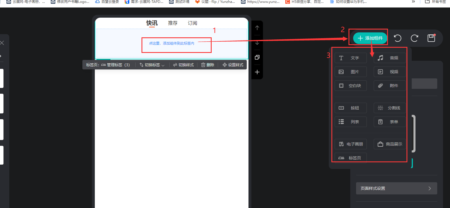 點擊【標簽頁內(nèi)】,點擊【添加組件】,可以添加文字,圖片,音視頻,按鈕,表單等內(nèi)容在標簽頁上。