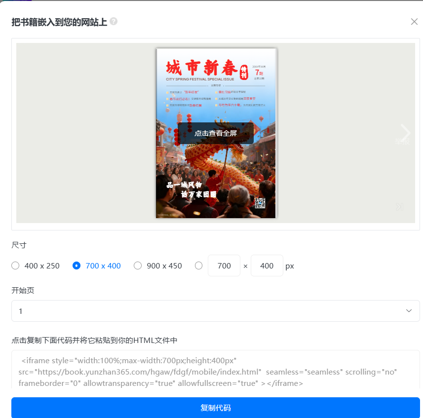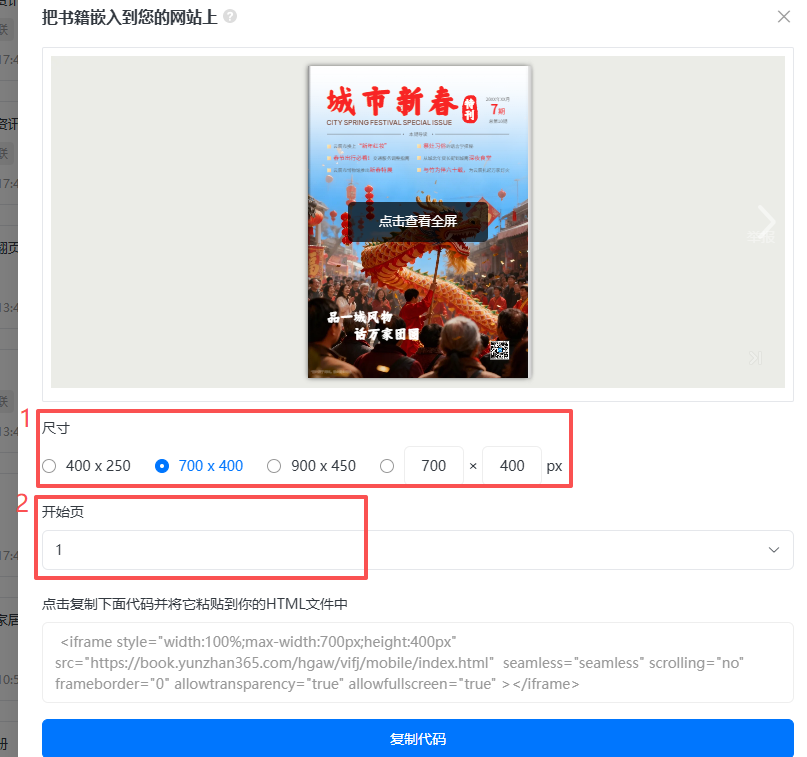 2、設(shè)置電子書嵌入網(wǎng)站后的大小和開始頁(yè)