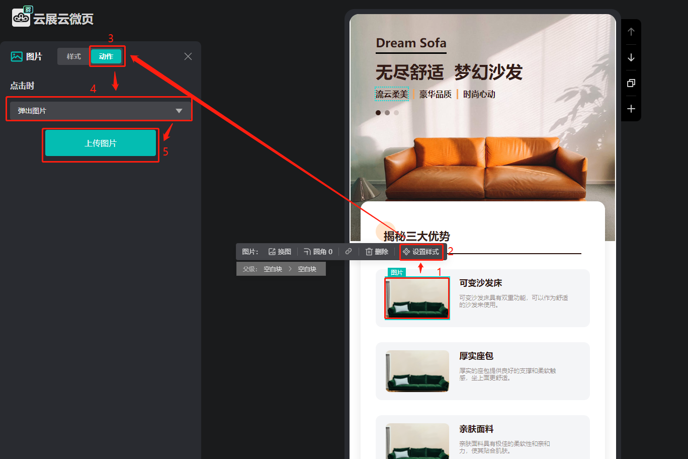 選中圖片,點(diǎn)擊【設(shè)置樣式】,然后點(diǎn)擊動(dòng)作,【點(diǎn)擊時(shí)】選擇【彈出圖片】,意思是點(diǎn)擊圖片就會(huì)彈出上傳的圖片,最后點(diǎn)擊【上傳圖片】。
