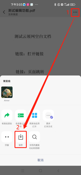先將文件發(fā)到微信上并打開(kāi),點(diǎn)擊右上角三個(gè)點(diǎn),點(diǎn)擊【保存】,文件便會(huì)保存到手機(jī)相應(yīng)的路徑上。