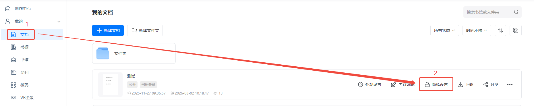點進【文檔】,找到對應(yīng)電子書,然后點擊【隱私設(shè)置】。